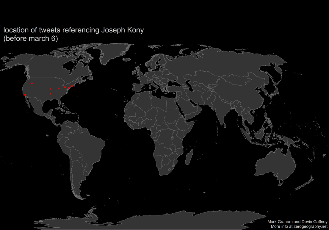 "#Kony’s moment of visibility was both brief and largely transatlantic. This Western-centric pattern of information flow is not necessarily surprising and can be found on many other online platforms. However, given the video’s relevance to East Africa, and the global diffusion of Twitter (e.g. Indonesians form the world’s 6th largest population of Twitter users), we might have expected #Kony to have a slightly less clustered geography."