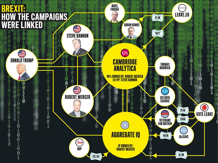 In 2013, 23-year old CHRIS WYLIE, a Canadian data scientist who had worked on the Obama campaign, was recruited as head of research for SCL Ltd, a contractor developing military ‘information operations’ for the US and UK. Within months he met Steve Bannon and Robert Mercer to set up Cambridge Analytica – a ‘propaganda machine’ designed to win the 2016 US Presidential elections, using Brexit as its ‘petri dish’. The tools of cyber warfare were now turned on the countries that developed them.