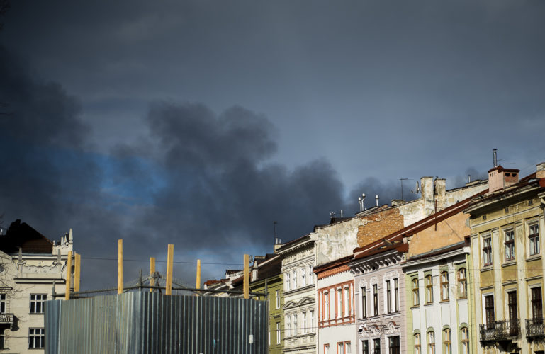 A dense cloud of black smoke crept out from behind the buildings as we peered through windows overlooking Lviv’s Rynok Square. Nervously, we awaited confirmation from Ukrainian territorial defence.